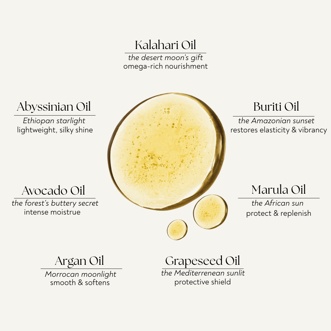 At the heart of the formula is Kalahari Melon Seed Oil — a highly restorative oil rich in essential fatty acids and antioxidants that strengthen the hair and protect it from breakage. It is paired with Abyssinian Oil, Marula Oil, and Hemisqualane, which work together to reduce frizz, seal split ends, improve smoothness, and support long-term hair health.